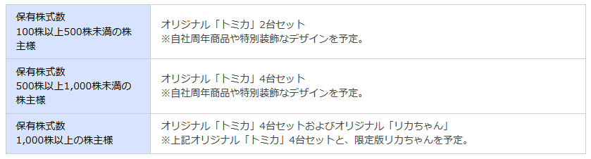 おもちゃブランドとしての信頼感に加え、長年愛されるトミカブランドの魅力が、株主優待でもしっかり感じられます。