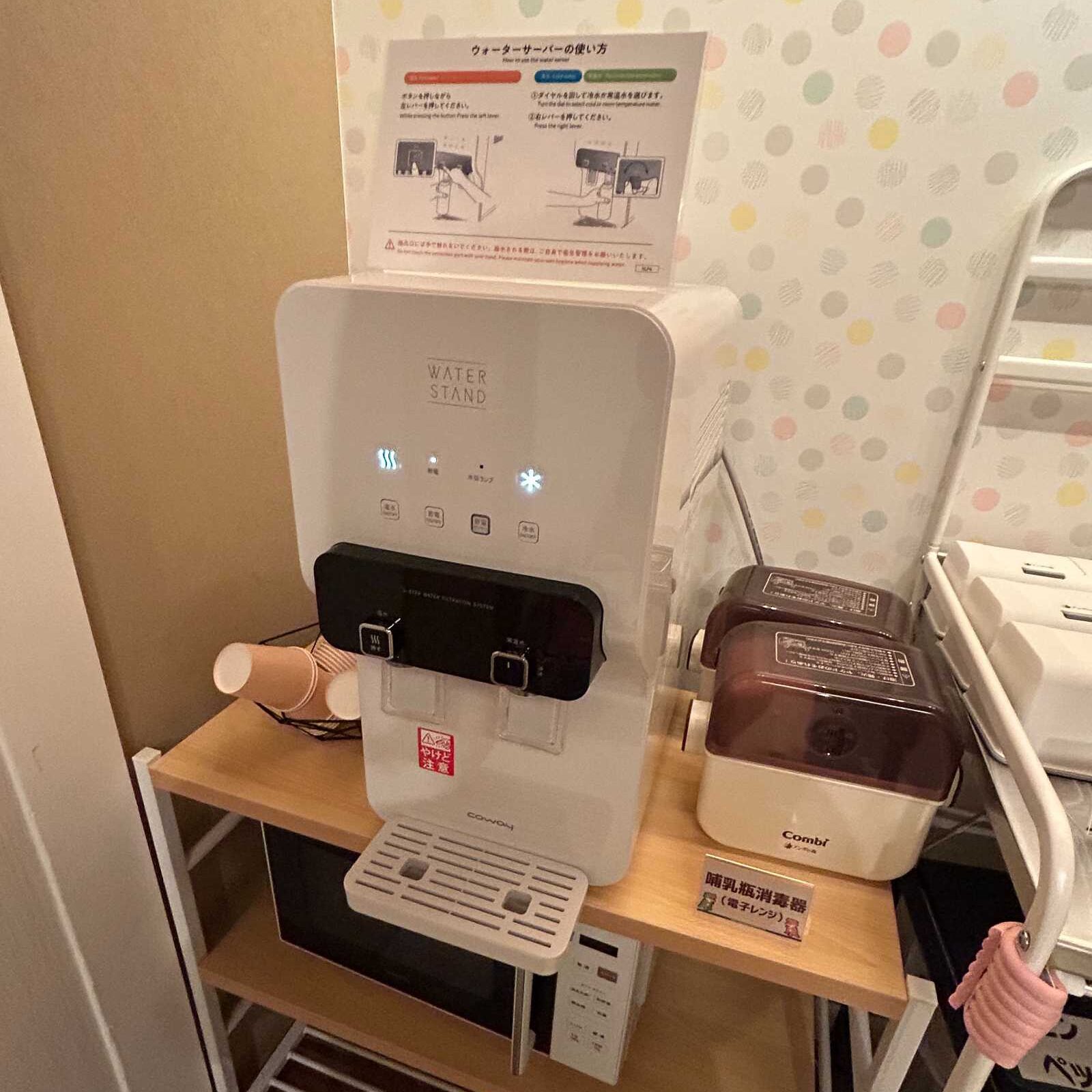 お湯の出るウォーターサーバや哺乳瓶の消毒器もあり、安心して利用できます。