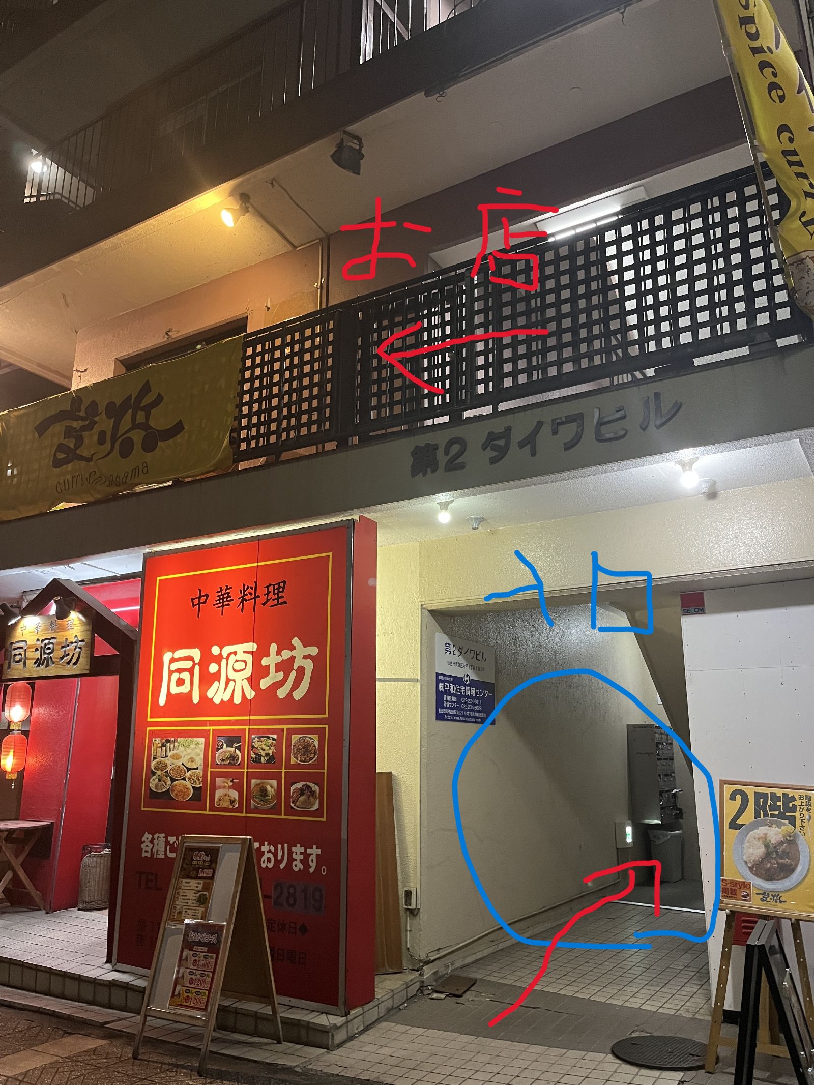 Googleマップを頼りに歩いて向かいましたが、夜だと少しわかりにくい場所にあります。