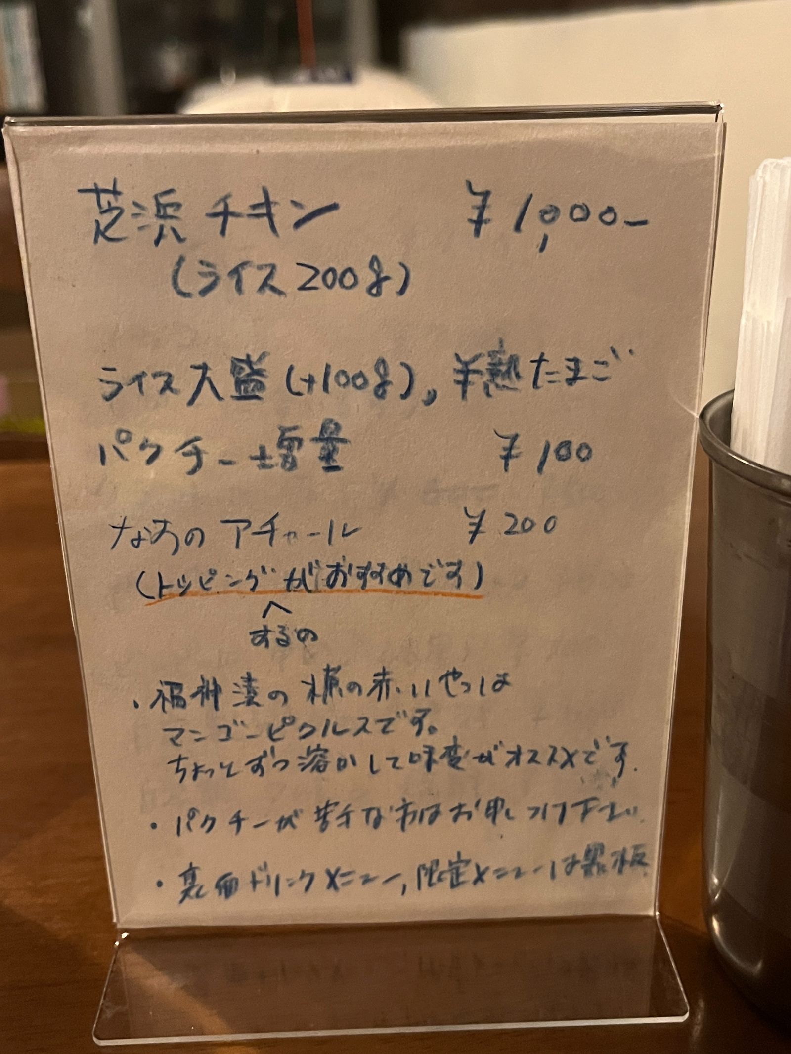 今回は、「芝浜チキン」に「なすのアチャール(インド風漬物)」をトッピングで注文しました。