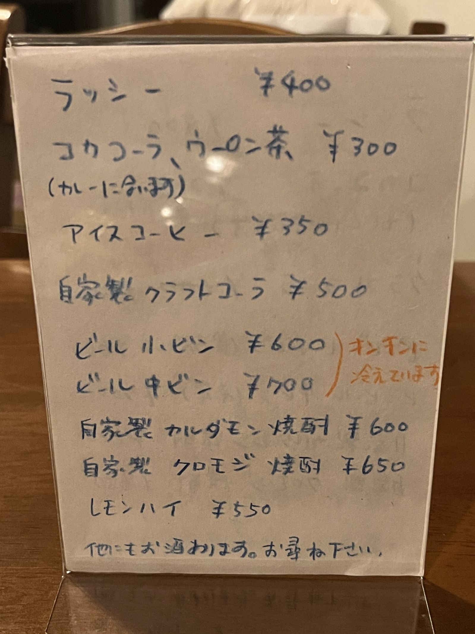 ドリンクは、ラッシーやビール、スパイス焼酎など。