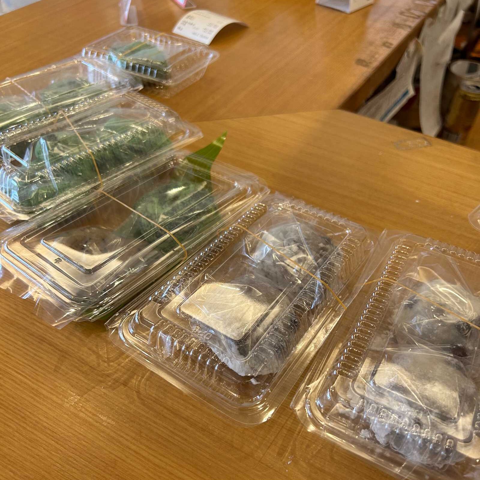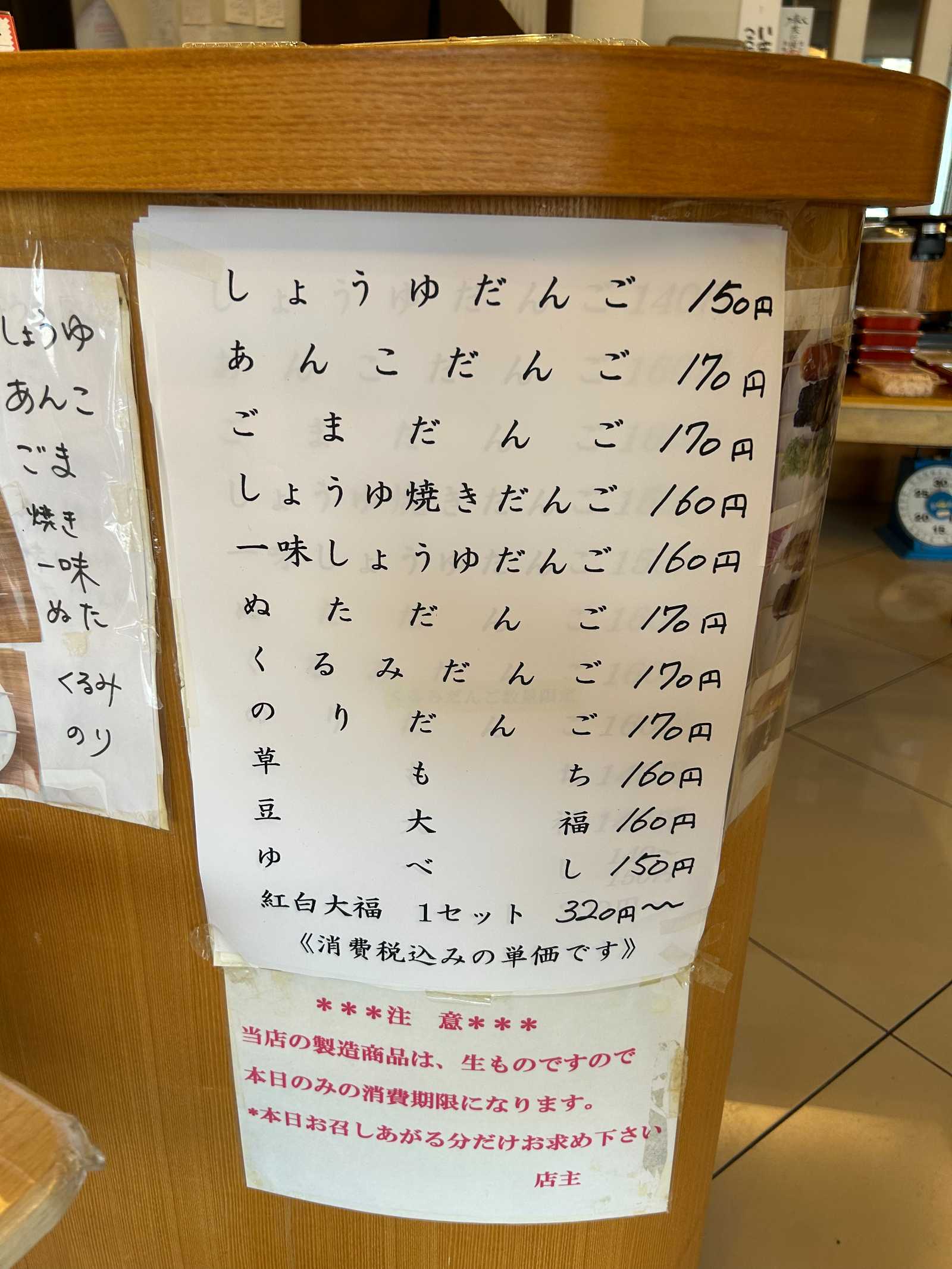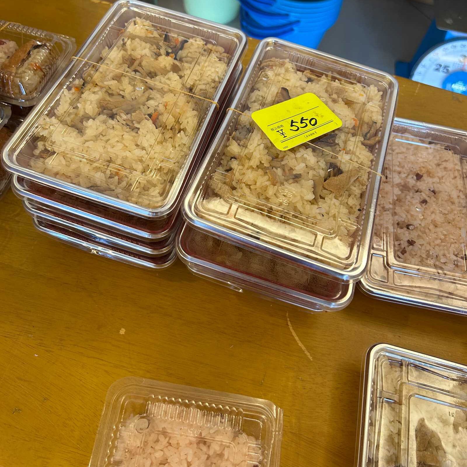 だんご類、大福、ゆべし、赤飯、炊き込みご飯、おいなりなどが並んでいます。