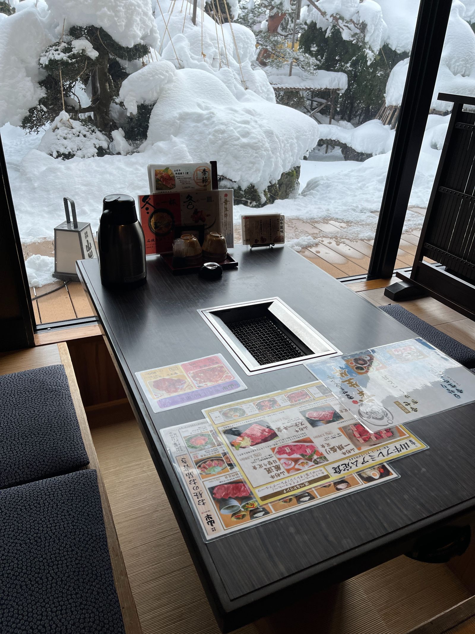 窓際の席から雪景色を楽しみながらの食事。
